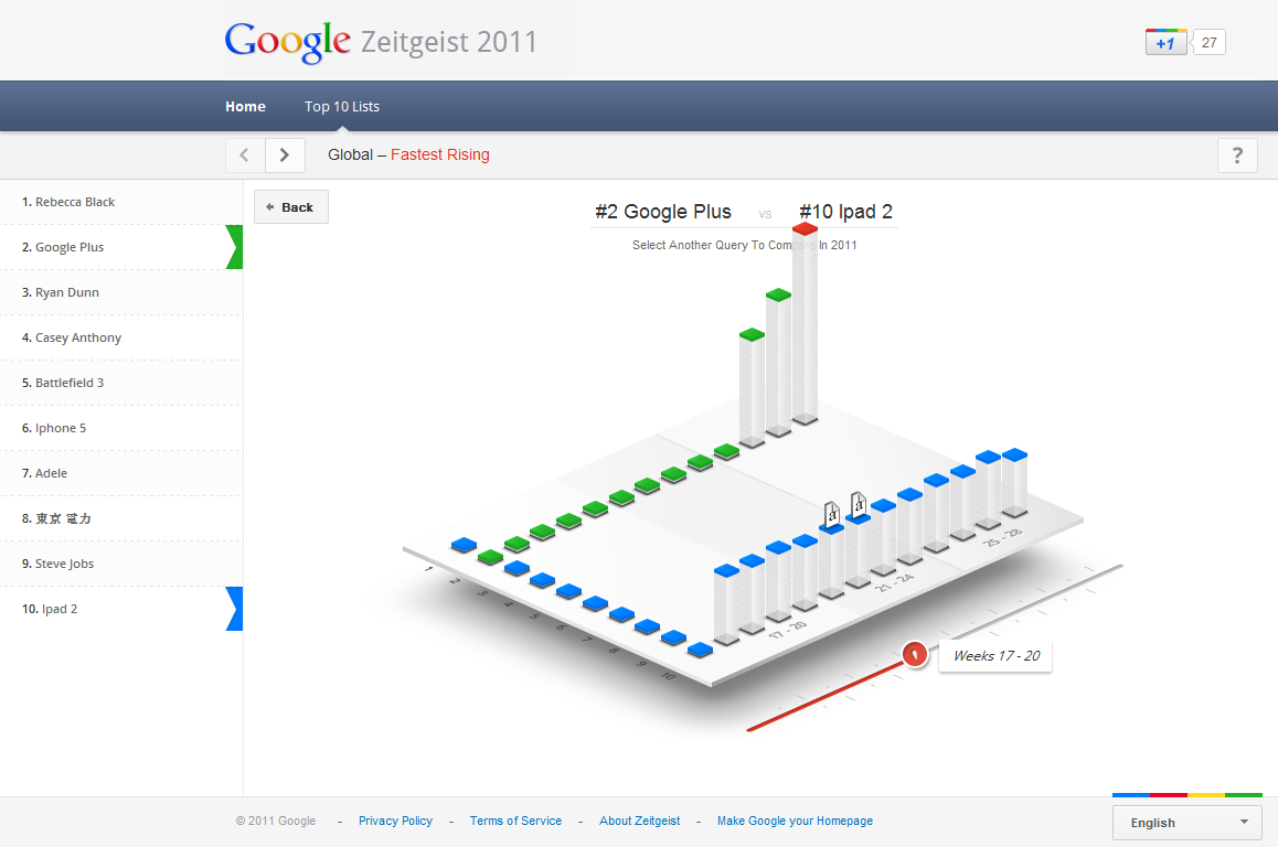The Google Zeitgeist report for 2011 has been published reviewing the most popular news, events, people and stories according to search queries typed into Google during the year. This year’s report contains a baffling 3D visualisation to present the top 10 lists.