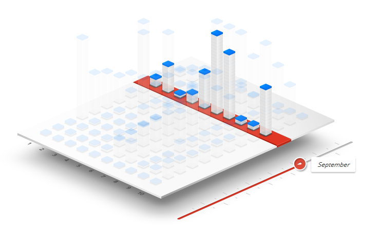 Here you have a 3D, multi-series bar chart with a slider device to help you navigate through the 12 months of the year. Not only do you have to contend with having to adjust your eyes to the 3D plane, but for some reason only the tops of the bars are actually visually distinguishable with the bars themselves ghostly transparent.