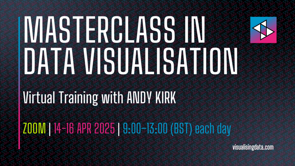 I’m very happy to announce details of a new public training course. This is a virtual ‘Masterclass in Data Visualisation‘ that will take place online over 14-16 April 2026, 9am to 1pm (UK, BST) each day.