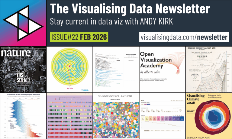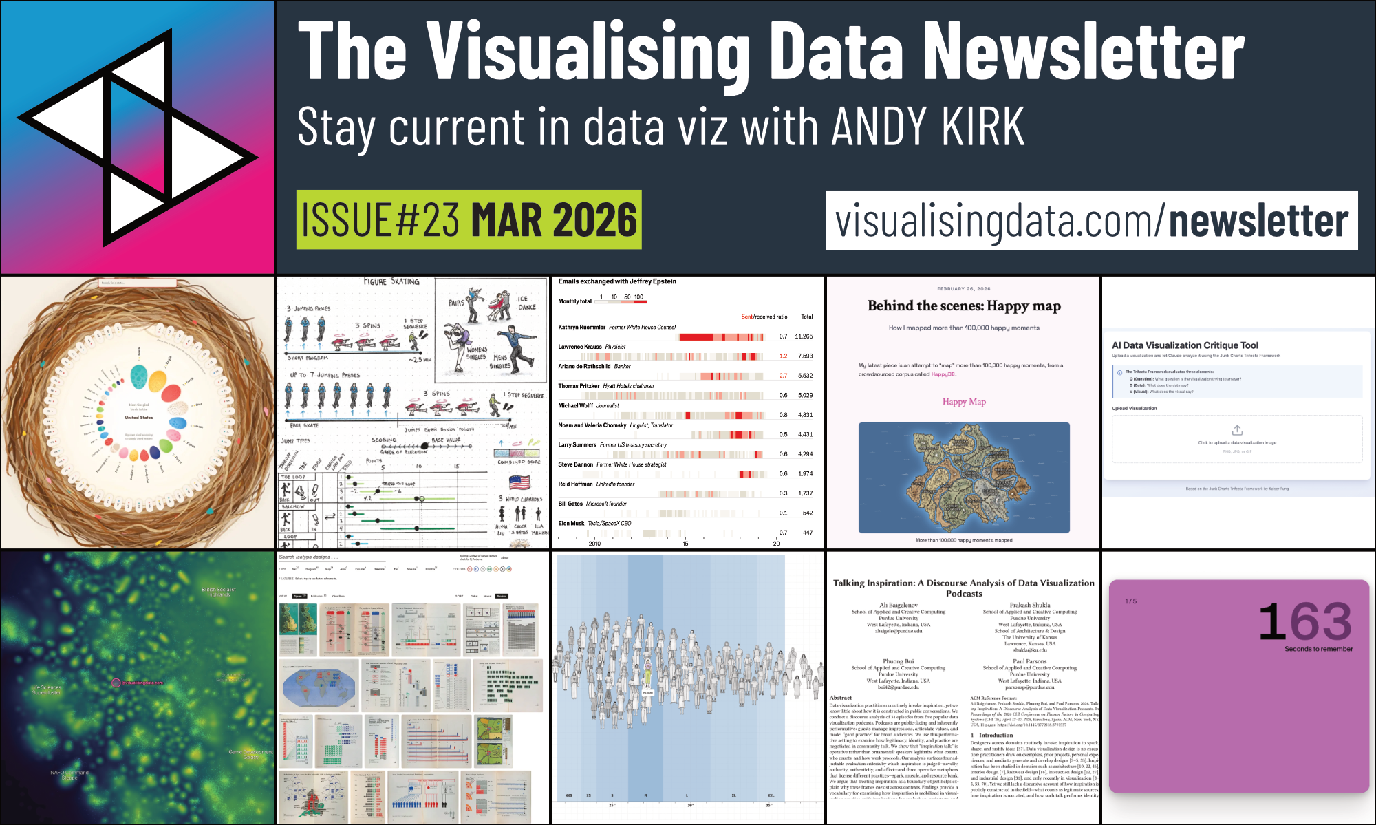 In each monthly issue I curate collections of excellent dataviz content and send it straight to your inbox. This includes links to some of the best, most interesting, most zeitgeist-y, or thought-provoking data visualisation-related content I’ve encountered during the previous month, including the following: