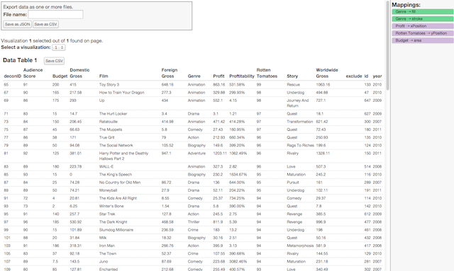 The D3 Deconstructor is a Google Chrome extension for extracting data from D3.js visualizations. D3 binds data to DOM elements when building a visualization. Our D3 Deconstructor extracts this data and the visual mark attributes (such as position, width, height, and color) for each element in a D3 visualization.